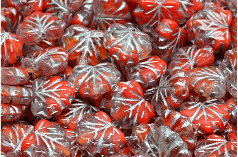 メープルリーフビーズ、レッドシルバーライン(R0942-54301)、ガラス、チェコ共和国