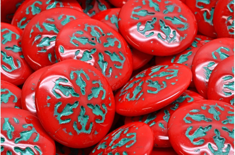 スノーフレークカボションビーズ、不透明レッドティールライン入り(93200-54316)、ガラス、チェコ共和国