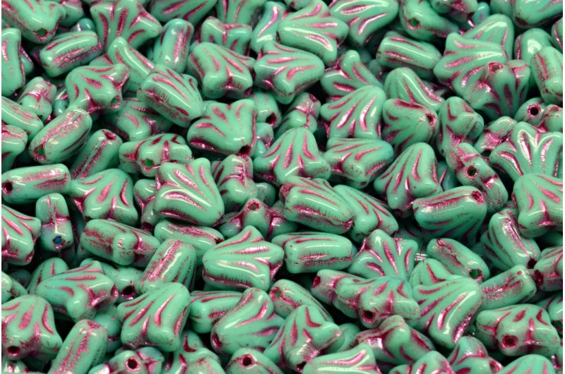 ユリの花のビーズ、ターコイズピンクのライン入り(63130-54321)、ガラス、チェコ共和国