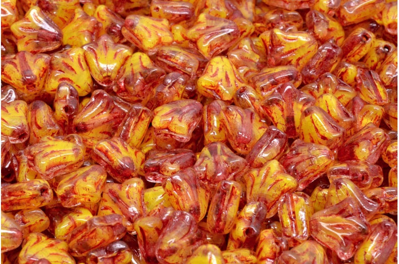 ユリの花のビーズ、黄赤のライン入り(R0812-54314)、ガラス、チェコ共和国