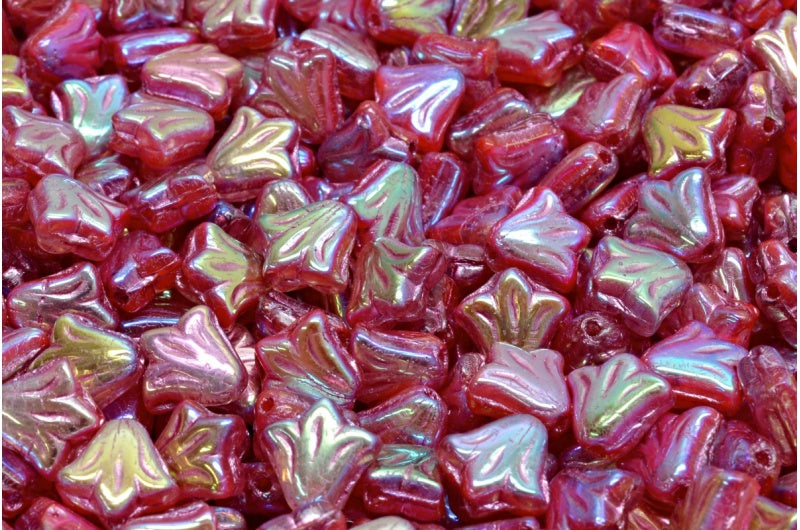 ユリの花ビーズ、レッドアブフル(2Xサイド)ピンクライン(R0930-28703-54321)、ガラス、チェコ共和国