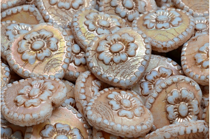 ローズ付きハートビーズ、ホワイトオパールマットABフル(2Xサイド)銅裏地(02020-84100-28703-54324)、ガラス、チェコ共和国