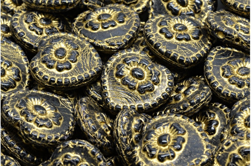 バラ付きハートビーズ、ブラックゴールドライン(23980-54302)、ガラス、チェコ共和国