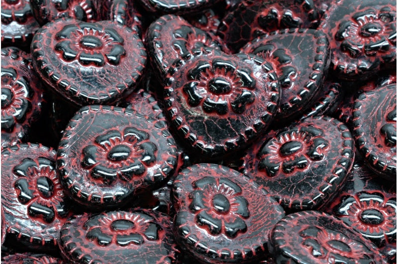 バラ付きハートビーズ、黒と赤のライン入り(23980-54310)、ガラス、チェコ共和国