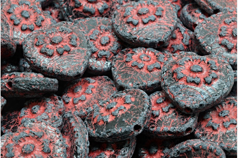 バラ付きハートビーズ、黒エッチング、赤ライン入り(23980-etch-54310)、ガラス、チェコ共和国