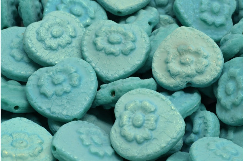 ローズ付きハートビーズ、トルコ石エッチングABフル(2Xサイド)(63140-ETCH-28703)、ガラス、チェコ共和国