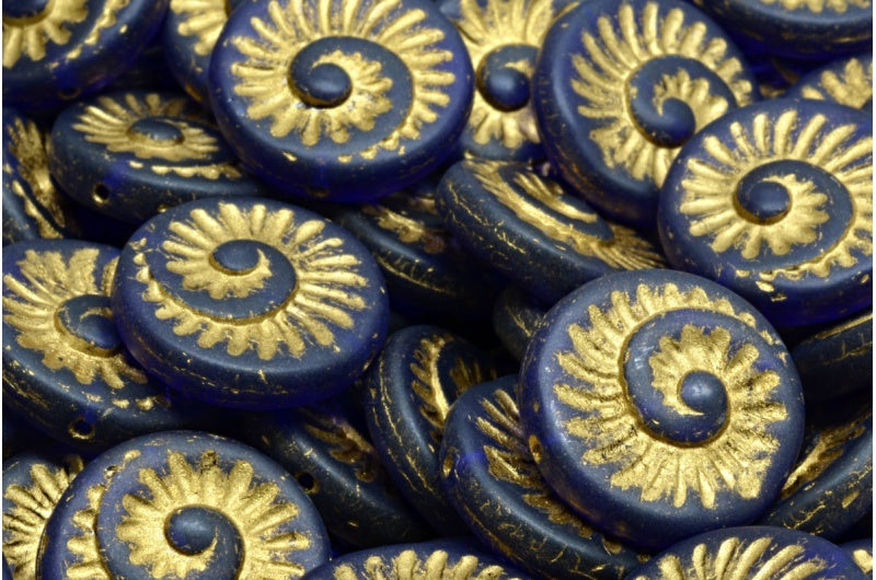 化石貝殻ビーズ、透明ブルーマットゴールドライン(30090-84100-54302)、ガラス、チェコ共和国