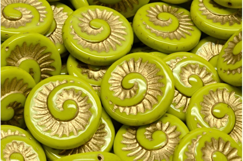 化石貝殻ビーズ、不透明グリーンゴールドライニング(53400-54302)、ガラス、チェコ共和国