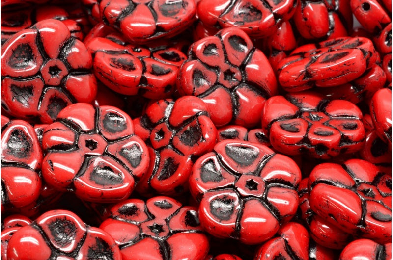 プリムローズフラワービーズ、不透明赤黒裏地(93200-54313)、ガラス、チェコ共和国