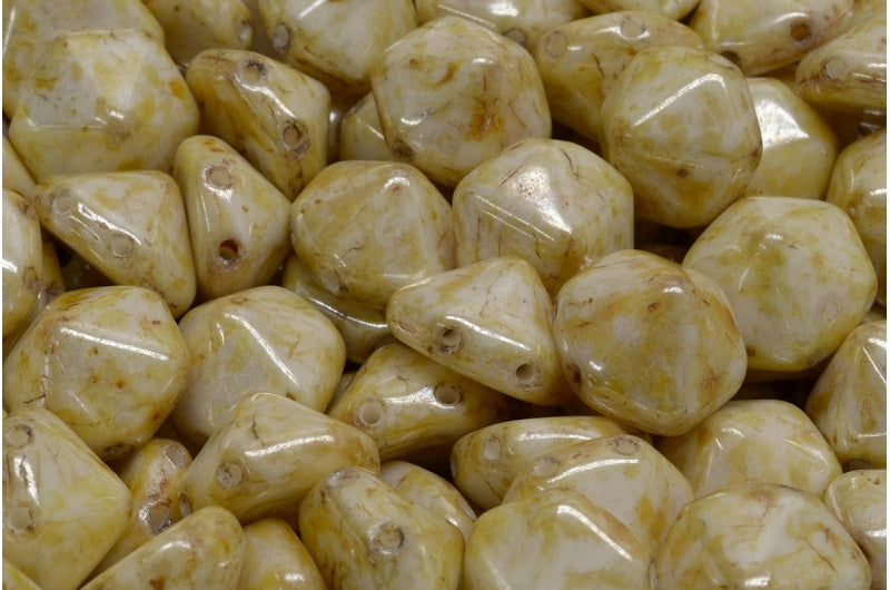 2穴六角形ピラミッドビーズ、ホワイトステイン、光沢琥珀色(02010-65401)、ガラス、チェコ共和国