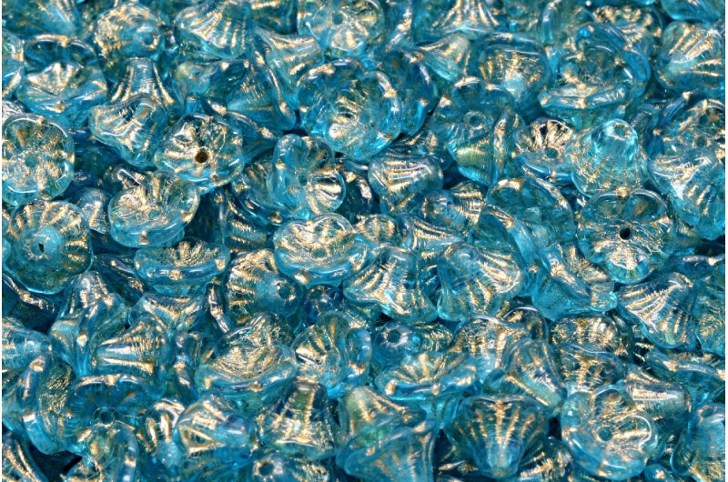 ベルフラワーカップビーズ、透明アクアゴールドライン(60010-54302)、ガラス、チェコ共和国