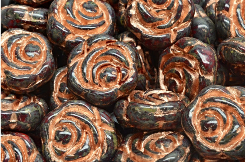 フラットラウンドローズフラワービーズ、オパールレッドトラバーチン銅ライニング(91240-86800-54318)、ガラス、チェコ共和国