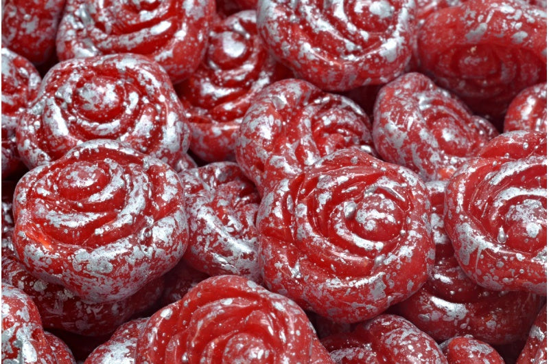 フラットラウンドローズフラワービーズ、オパールレッドシルバースプラッシュ(91240-94400)、ガラス、チェコ共和国
