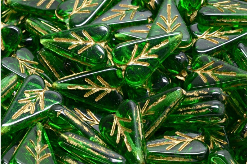 ハートリーフビーズ、エメラルドグリーン、ゴールドライン(50120-54302)、ガラス、チェコ共和国
