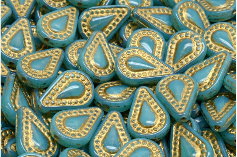 フィリグリーティアドロップビーズ、オパールアクアゴールドライン(61100-54302)、ガラス、チェコ共和国
