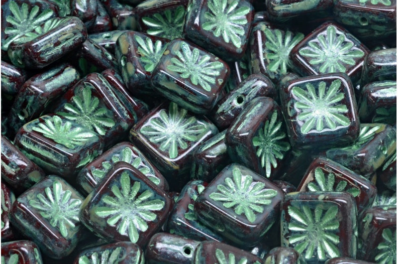 スクエアドキウイビーズ、13530 トラバーチングリーンライン(13530-86800-54322)、ガラス、チェコ共和国