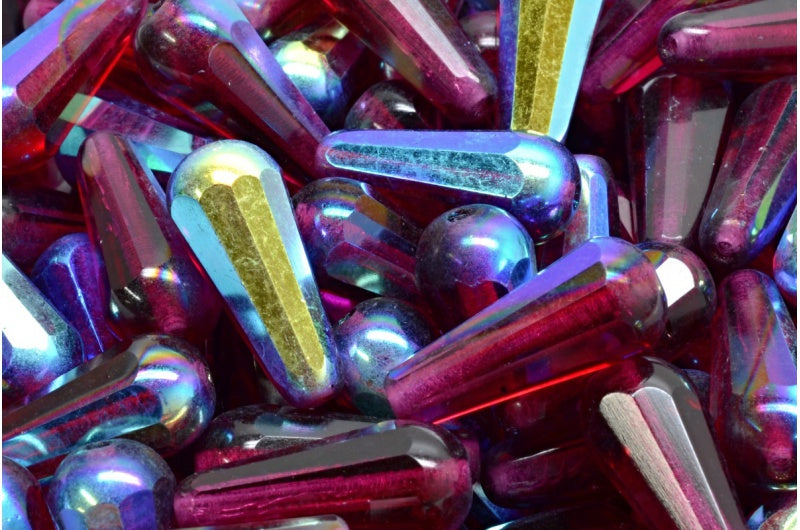 ファセット加工のファイアポリッシュ仕上げのティアドロップビーズ、透明レッドAb(70350-28701)、ガラス、チェコ共和国