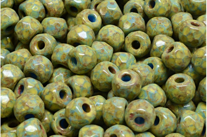 ファセット加工のポニーベーグルビーズ、不透明ブルートラバーチンベージュイエロースポット(33100-86800-33303)、ガラス、チェコ共和国