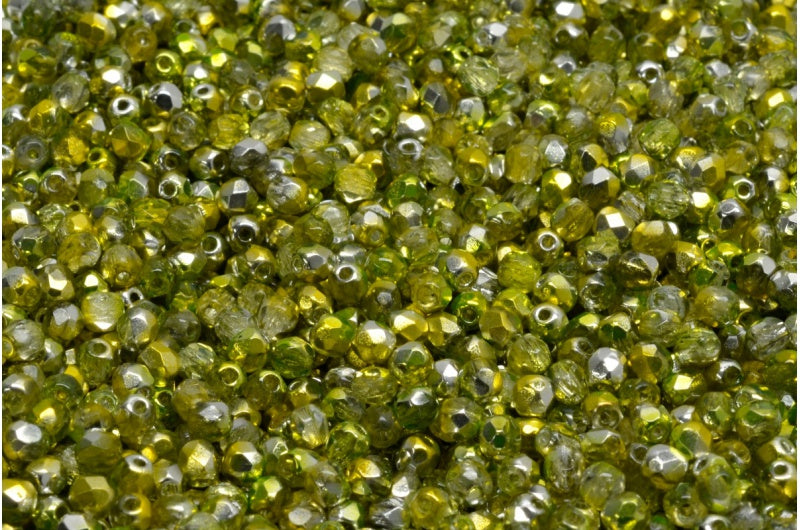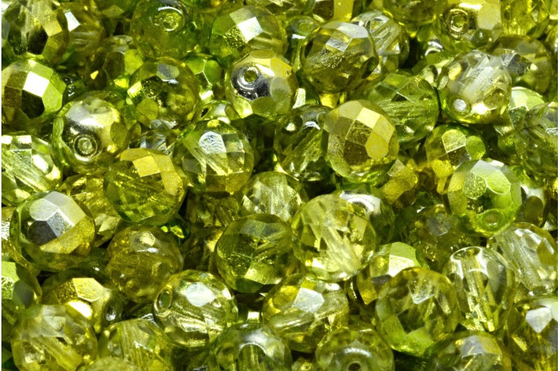 ファセット加工ラウンドファイアポリッシュビーズ、クリスタルグロッシーグリーンイエロー(00030-48226)、ガラス、チェコ共和国