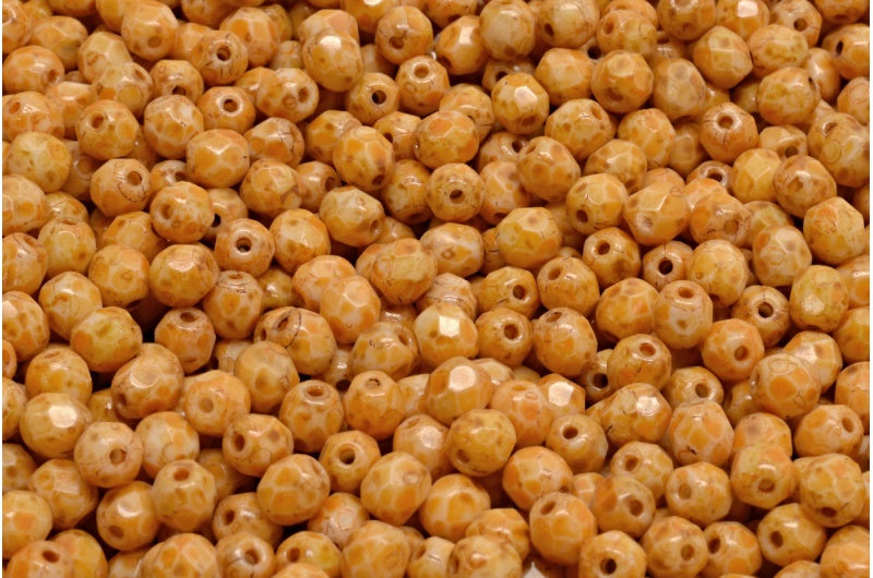 ファセット加工のラウンド型ファイヤーポリッシュビーズ、チョークホワイトトラバーチンオレンジスポット(03000-86800-33302)、ガラス、チェコ共和国