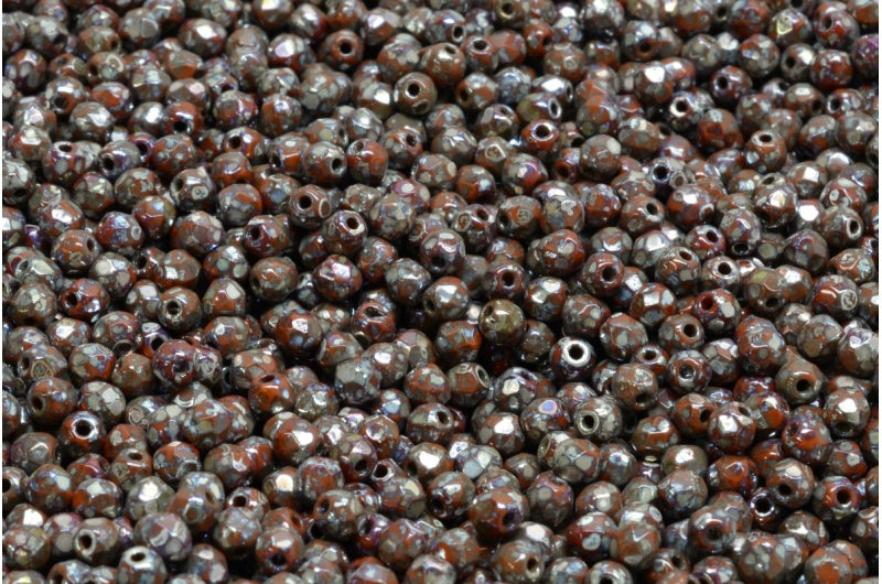 ファイアポリッシュファセットビーズラウンド、不透明ブラウンピカソ(13610-43400)、ボヘミアクリスタルガラス、チェコ共和国