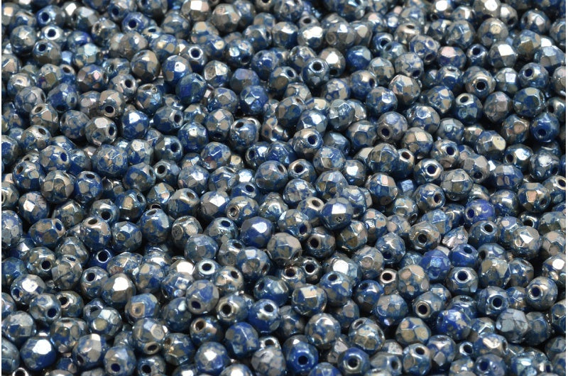 ファイアポリッシュファセットビーズラウンド、不透明ブルーピカソ(33050-43400)、ボヘミアクリスタルガラス、チェコ共和国