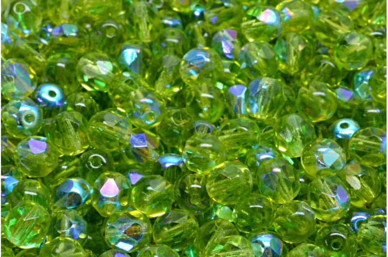 ファセット加工ビーズ ラウンド、透明グリーンAB(50220-28701)、ボヘミアクリスタルガラス、チェコ共和国