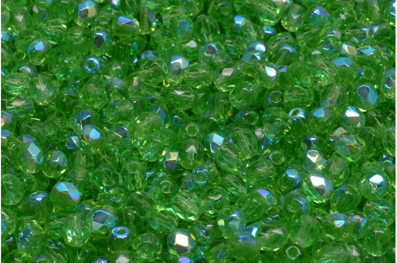 ファセット加工ビーズ ラウンド、透明グリーンAB(50420-28701)、ボヘミアクリスタルガラス、チェコ共和国