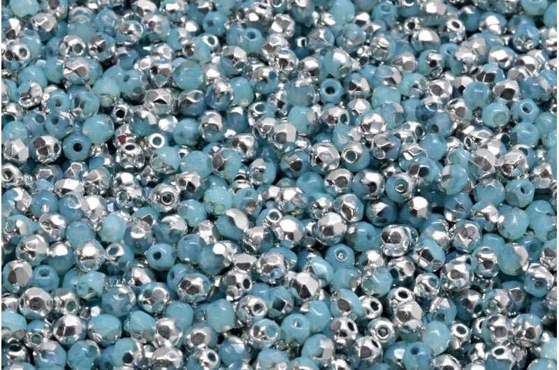 ファセットラウンドファイアポリッシュビーズ、オパールアクアクリスタルシルバーハーフコーティング(61010-27001)、ガラス、チェコ共和国