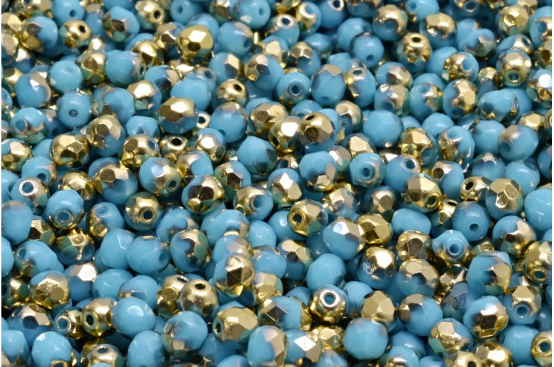 ファセット加工ラウンドビーズ、ターコイズブルーゴールド(63030-26441)、ボヘミアクリスタルガラス、チェコ共和国