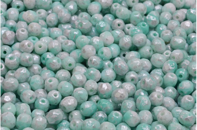 ファセットラウンドファイアポリッシュビーズ、ターコイズチョークホワイトシルバースプラッシュ(63130-03000-94400)、ガラス、チェコ共和国