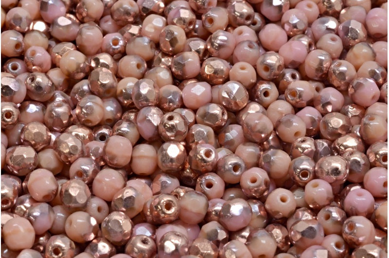 ファセット加工ラウンドファイアポリッシュビーズ、不透明ピンクローズゴールドカプリ(74020-27101)、ガラス、チェコ共和国