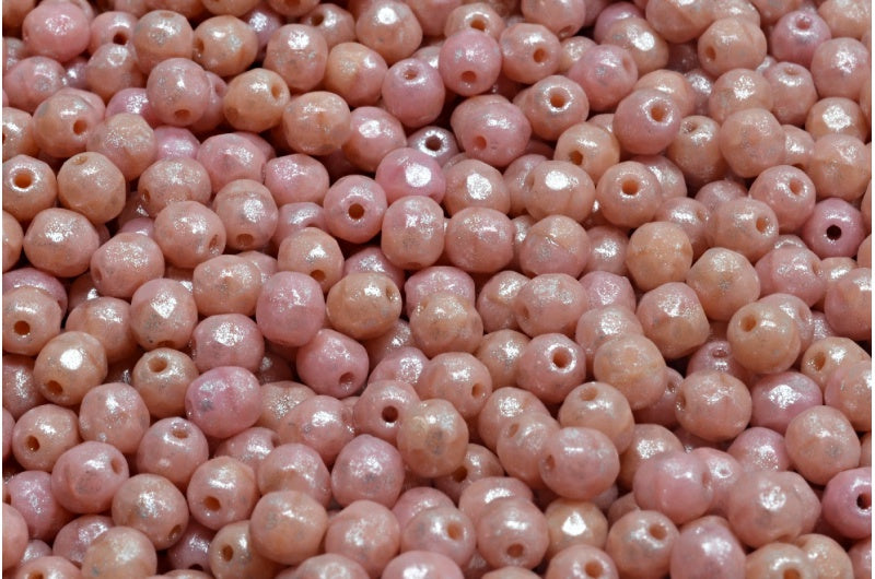 ファセット加工ラウンドファイアポリッシュビーズ、不透明ピンクベージュトラバーチンスポット(74020-33301)、ガラス、チェコ共和国