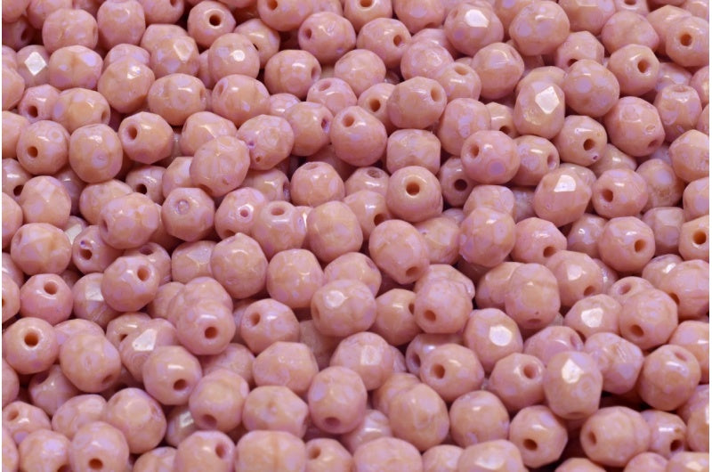 ファセット加工ラウンドファイアポリッシュビーズ、不透明ピンクコールドパープルスポット(74020-33305)、ガラス、チェコ共和国