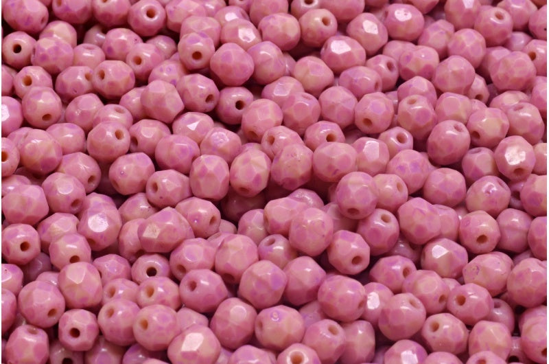 ファセット加工ラウンドファイアポリッシュビーズ、不透明ピンクピンクスポット(74020-33306)、ガラス、チェコ共和国