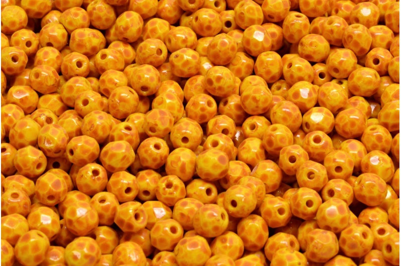 ファセット加工ラウンドファイアポリッシュビーズ、イエローオレンジスポット(83120-33302)、ガラス、チェコ共和国