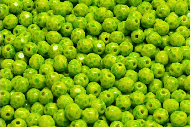 ファセット加工の丸型ファセットポリッシュビーズ、黄緑色の斑点(83120-33311)、ガラス、チェコ共和国