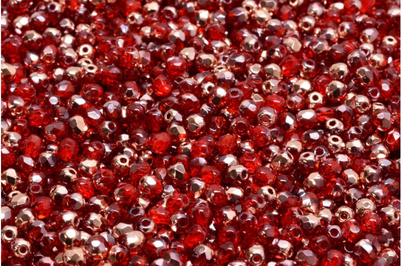 ファセットラウンドファイアポリッシュビーズ、ルビーレッドローズゴールドカプリ(90080-27101)、ガラス、チェコ共和国