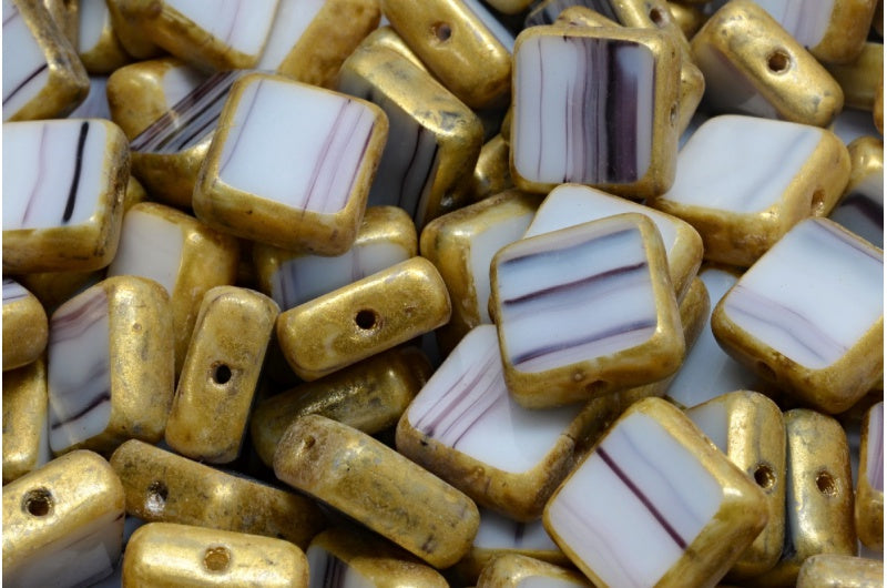 テーブルカットスクエアビーズ、ホワイトブラックゴールドスプラッシュ(02010-23980-86720)、ガラス、チェコ共和国