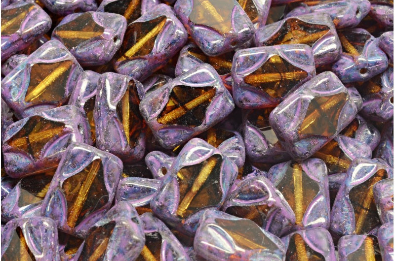 テーブルカットの長方形ビーズ、オレンジに茶色の線、トラバーチンピンクの斑点(18016-86800-33306)、ガラス、チェコ共和国