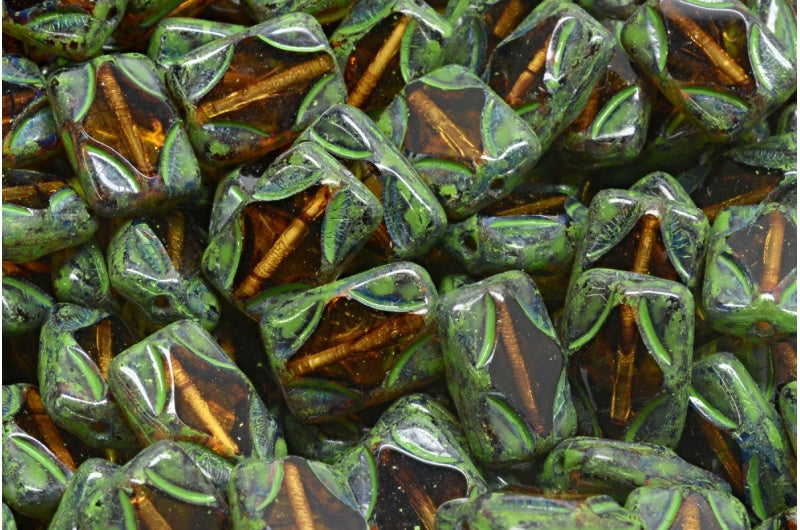 テーブルカットの長方形ビーズ、オレンジに茶色の線、トラバーチングリーンの斑点(18016-86800-33311)、ガラス、チェコ共和国