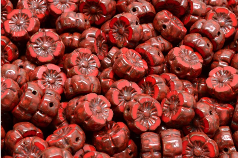テーブルカットハワイフラワービーズ、不透明レッドトラバーチンベージュオレンジスポット(93200-86800-33307)、ガラス、チェコ共和国