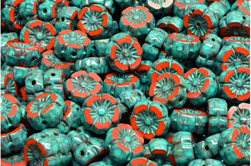 テーブルカットハワイフラワービーズ、不透明レッドトラバーチンターコイズスポット(93200-86800-33309)、ガラス、チェコ共和国