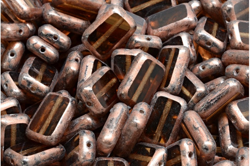 テーブルカット長方形ビーズ、透明ブラウン銅スプラッシュ(10230-86750)、ガラス、チェコ共和国