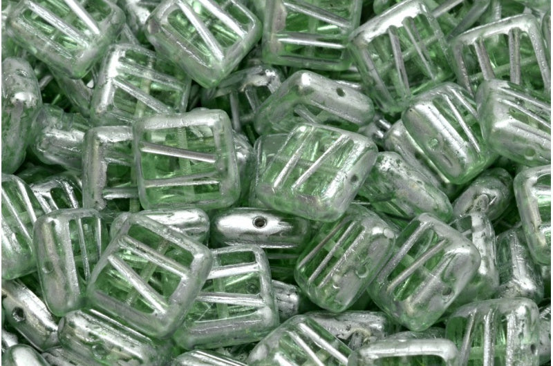 テーブルカットスクエアデザインビーズ、透明グリーンシルバースプラッシュ(50500-86700)、ガラス、チェコ共和国