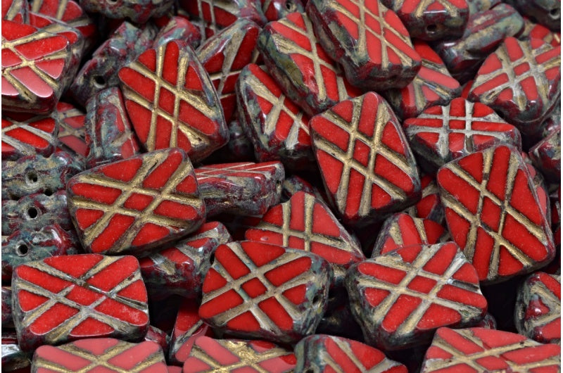 テーブルカットデザインの長方形ビーズ、不透明レッドトラバーチン、ゴールドライニング(93200-86800-54302)、ガラス、チェコ共和国