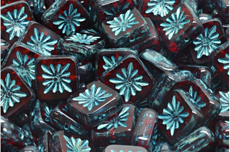 テーブルカットスクエアキウイビーズ、ルビーレッドトラバーチンライトブルーライン(90080-86800-43811)、ガラス、チェコ共和国