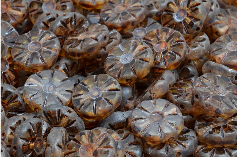 テーブルカットポリッシュひまわりビーズ、クリスタルマットトラバーチン(00030-84100-86800)、ガラス、チェコ共和国