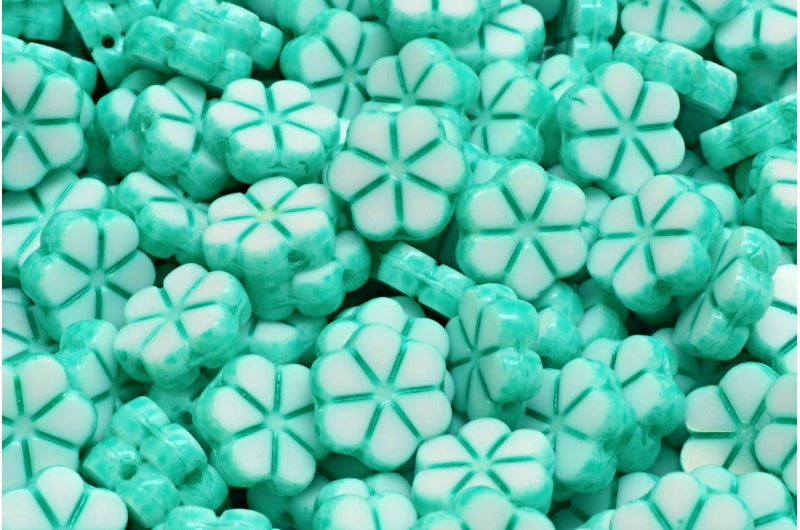 Table Cut Garland Flower Beads, White Opal Light Turquoise (02020-34309), Glass, Czech Republic