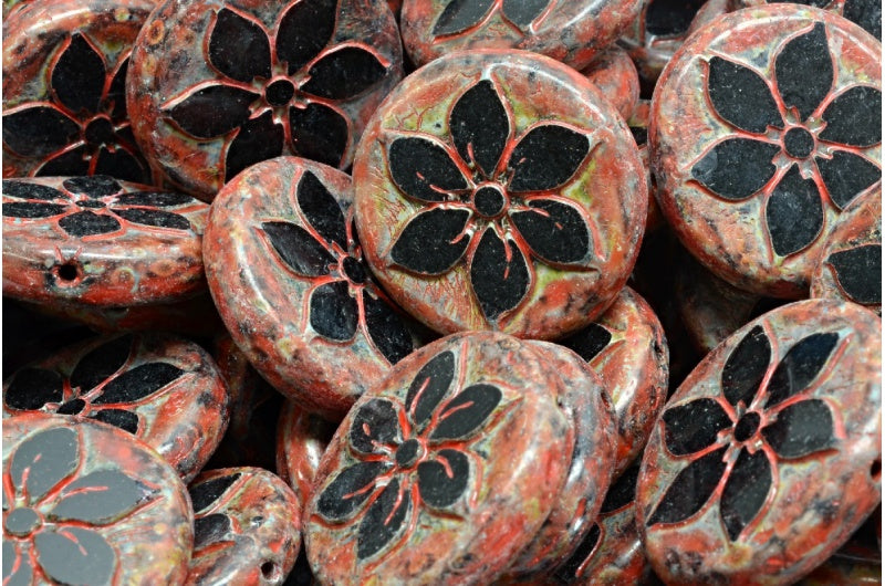 テーブルカットコインフラワービーズ、ブラックトラバーチンベージュオレンジスポット(23980-86800-33307)、ガラス、チェコ共和国